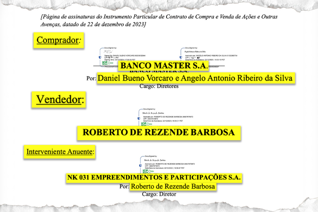 O documento é de dezembro de 2023 e mostra as condições de compra do banco do ex-dono do Voiter, Roberto de Rezende Barbosa. O negócio foi efetivado no ano seguinte e possui cláusula de confidencialidade de 5 anos. O banco Voiter era controlado pela NK031 Empreendimentos e Participações S.A., que tinha capital social de R$ 765,2 milhões, e foi adquirido pelo Master.
